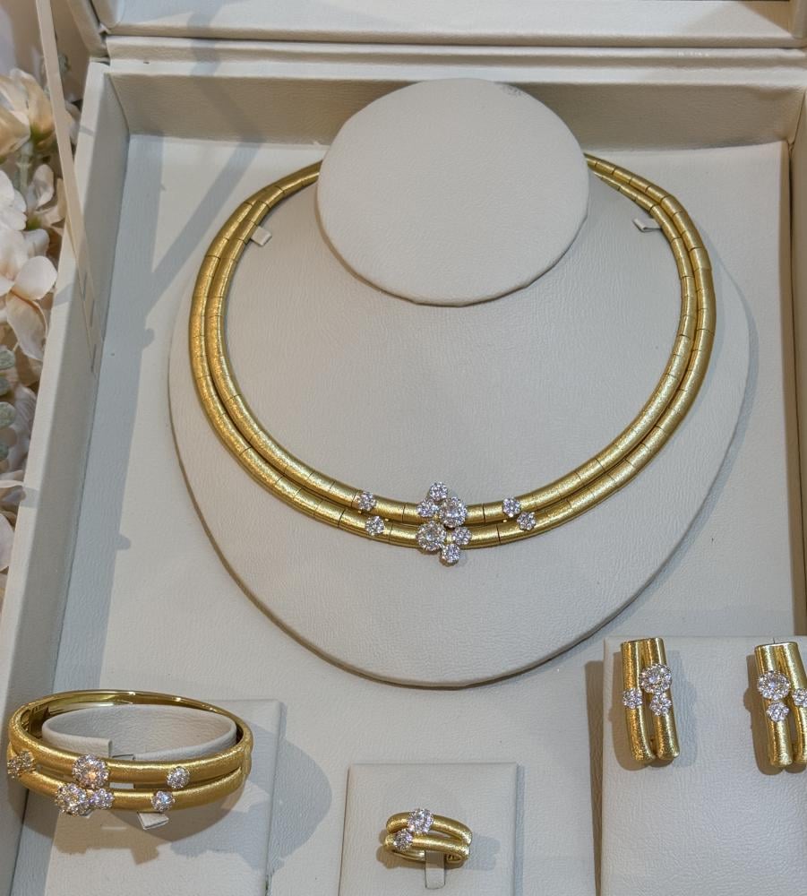 طقم أنيق مطلي بالذهب عيار 18K يجمع بين الفخامة والبساطة في تصميم يناسب جميع الأذواق.صُمم بدقة وبخامات عالية الجودة ليمنحك لمعانًا ذهبيًا فاخرًا يدوم طويلًا، ويضفي لمسة راقية على إطلالتك سواء في المناسبات أو الاستخدام اليومي. مثالي كهدية فاخرة أو كقطعة أساسية في مجموعة مجوهراتك.